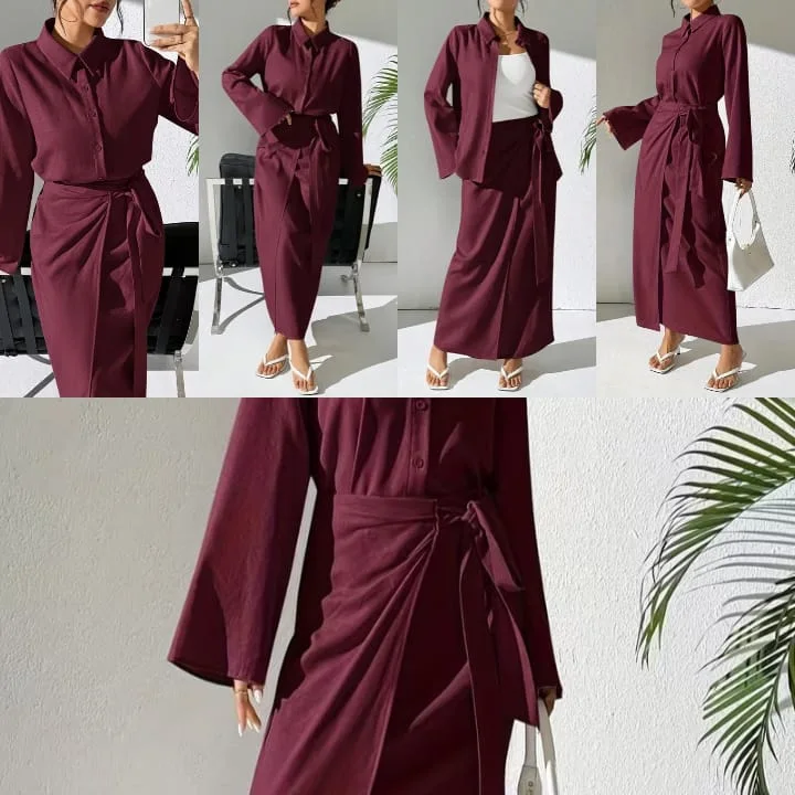 - Composition : Deux pièces – chemise + jupe drapée Tailles : S, M, L, XL, XXL